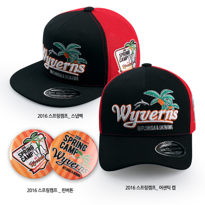 SK 2016시즌 스프링캠프 모자는 선수들과 동일한 '어센틱'과 트렌디한 '스냅백' 2종류다. 검정색과 빨강색을 조합한 가운데 구단 로고와 미국 플로리다 야자수, 일본 오키나와 돌고래, 스프링캠프 엠블럼 등이 새겨져 있다.