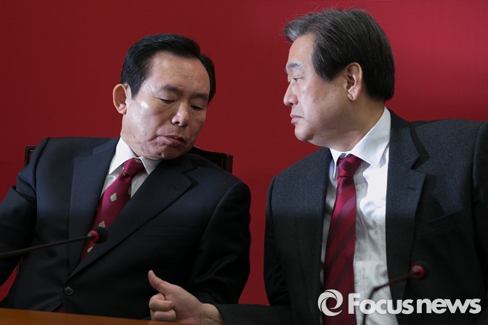 (서울=포커스뉴스) 김무성(오른쪽) 새누리당 대표와 이인제 최고위원이 14일 오전 서울 여의도 국회에서 열린 최고위원회의에 참석해 대화하고 있다.