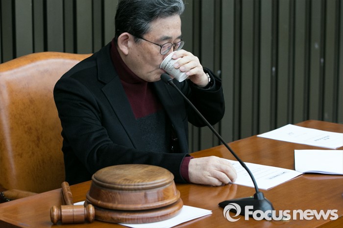 (서울=포커스뉴스) 이한구 새누리당 전국위원회 의장이 14일 오전 서울 여의도 국회에서 열린 제7차 상임전국위원회 의장석에 앉아 물을 마시고 있다. 이날 새누리당 전국위원회에서는 20대 총선 공천룰을 결정한다.
