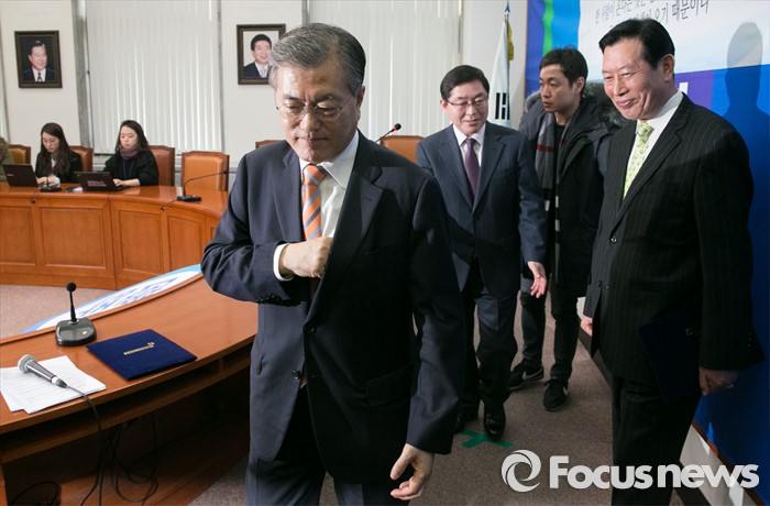 (서울=포커스뉴스) 문재인(왼쪽) 더불어민주당 대표가 14일 오전 서울 여의도 국회에서 하정열(오른쪽) 한국안보통일연구원장, 박희승 전 수원지법 안양지원장 인재영입 기자회견을 마친 뒤 퇴장하고 있다.
