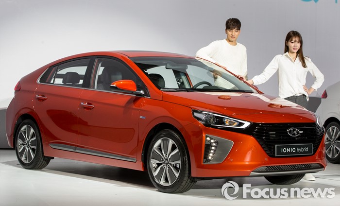 (서울=포커스뉴스) 14일 오전 서울 중구 동대문디자인플라자에서 모델들이 하이브리드 자동차 '아이오닉'을 선보이고 있다.