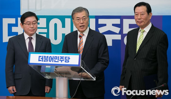 (서울=포커스뉴스) 문재인(가운데) 더불어민주당 대표가 14일 오전 서울 여의도 국회에서 하정열(오른쪽) 한국안보통일연구원장, 박희승 전 수원지법 안양지원장 인재영입 기자회견을 하고 있다.