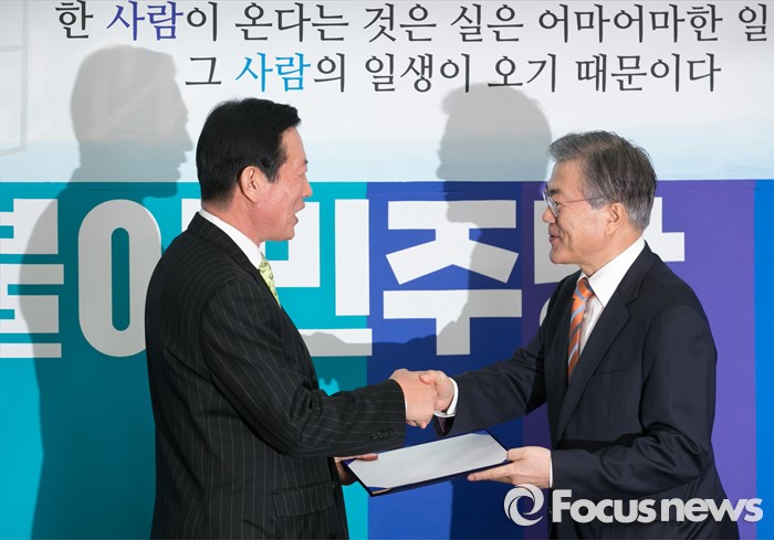 (서울=포커스뉴스) 문재인(오른쪽) 더불어민주당 대표가 14일 오전 서울 여의도 국회에서 열린 인재영입 기자회견에 참석해 하정열 한국안보통일연구원장으로부터 입당원서를 전달받고 있다.