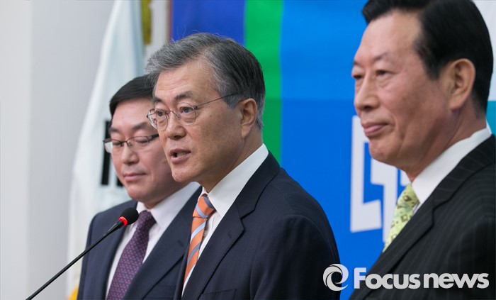 (서울=포커스뉴스) 문재인(가운데) 더불어민주당 대표가 14일 오전 서울 여의도 국회에서 하정열(오른쪽) 한국안보통일연구원장, 박희승 전 수원지법 안양지원장 인재영입 기자회견을 하고 있다.