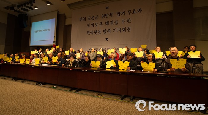 (서울=포커스뉴스) 한국정신대문제대책협의회와 시민사회단체가 14일 오후 서울 중구 프레스센터에서 시민사회단체와 학생, 예술 단체 등 사회각계각층이 참여하는 '한일 일본군 위안부 합의 무효와 정의로운 해결을 위한 전국행동' 발족 기자회견을 열고 있다.
