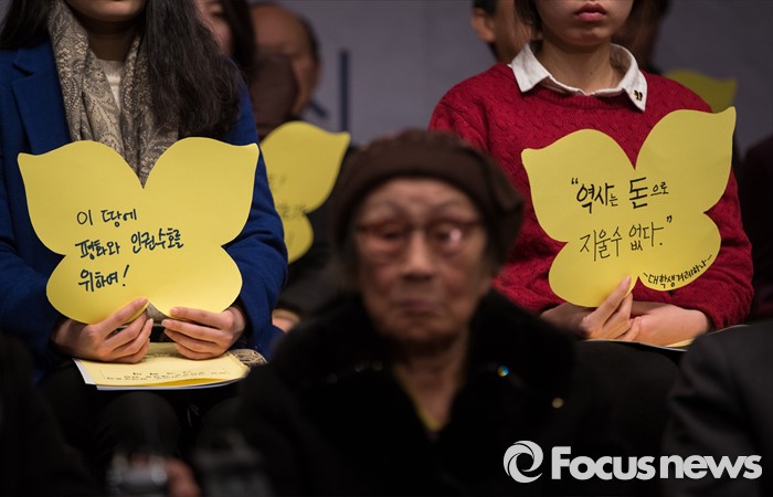 (서울=포커스뉴스) 한국정신대문제대책협의회가 14일 오후 서울 중구 프레스센터에서 시민사회단체와 학생, 예술 단체 등 사회각계각층이 참여하는 '한일 일본군 위안부 합의 무효와 정의로운 해결을 위한 전국행동' 발족 기자회견을 열고 있다.