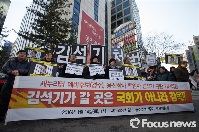 (서울=포커스뉴스) 용산참사 진상규명위원회 및 유가족들이 14일 오후 서울 영등포구 여의도 새누리당사앞에서 열린 새누리당 총선 예비후보(경주), 용산참사 책임자 김석기 규탄 기자회견을 열고 있다.
