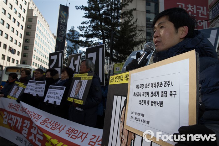 (서울=포커스뉴스) 용산참사 진상규명위원회 및 유가족들이 14일 오후 서울 영등포구 여의도 새누리당사앞에서 열린 새누리당 총선 예비후보(경주), 용산참사 책임자 김석기 규탄 기자회견을 열고 있다.