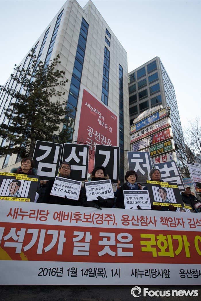 (서울=포커스뉴스) 용산참사 진상규명위원회 및 유가족들이 14일 오후 서울 영등포구 여의도 새누리당사앞에서 열린 새누리당 총선 예비후보(경주), 용산참사 책임자 김석기 규탄 기자회견을 열고 있다.