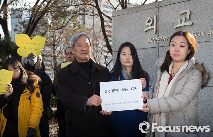 (서울=포커스뉴스) 14일 오후 '한일 일본군 위안부 합의 무효와 정의로운 해결을 위한 전국행동' 발족 기자회견을 마친 한국정신대문제대책협의회와 시민사회단체 행진단이 서울 중구 서울정부청사 앞에서 '한국 정부에게 보내는 요구서'를 외교부 관계자에게 전달하고 있다.