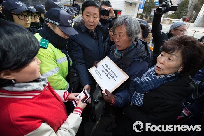 (서울=포커스뉴스) 용산참사 진상규명위원회 및 유가족들이 14일 오후 서울 영등포구 여의도 새누리당사앞에서 열린 새누리당 총선 예비후보(경주), 용산참사 책임자 김석기 규탄 기자회견이 끝나고 김석기 출당 촉구 의견서 및 항의서한을 새누리당 관계자에게 전달하고 있다.