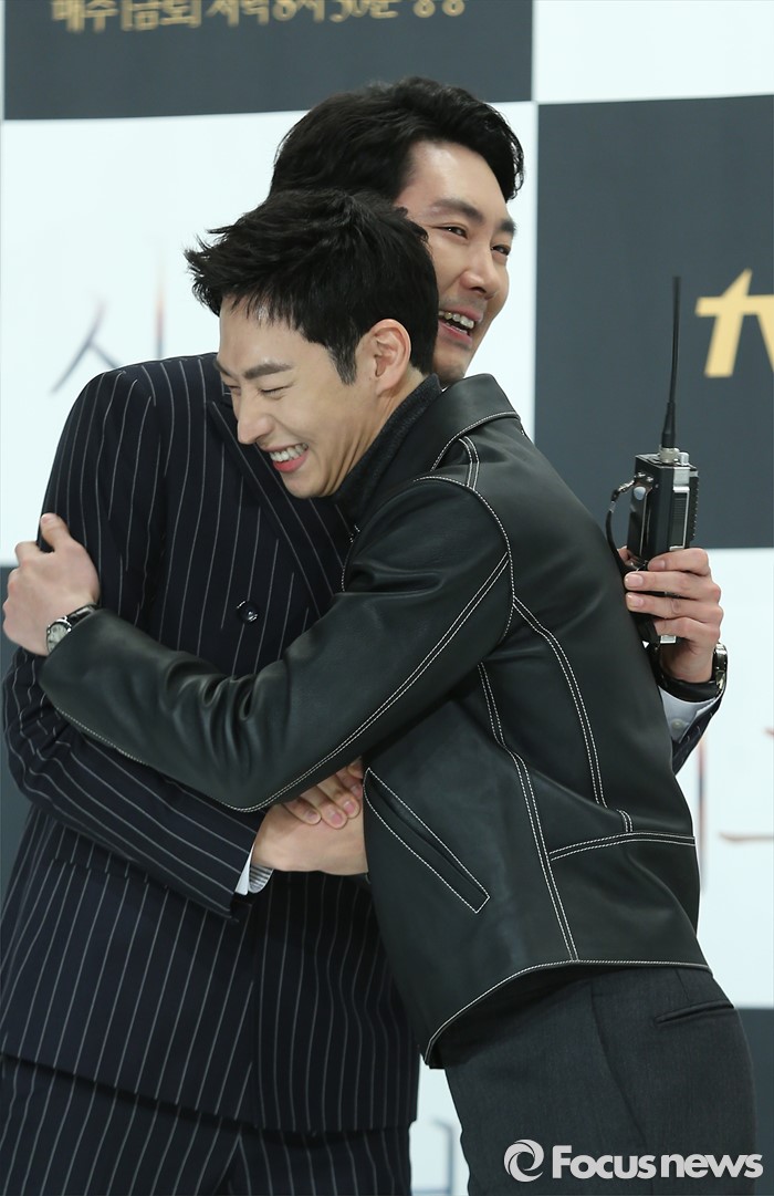 (서울=포커스뉴스) 14일 오후 서울 영등포구 타임스퀘어 아모리스홀에서 열린 tvN 10주년 특별기획 '시그널' 제작발표회에 참석한 배우 조진웅(왼쪽)과 이제훈이 포토타임을 갖고 있다.