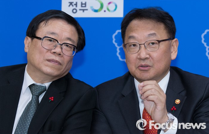 (세종=포커스뉴스) 유일호(오른쪽) 경제부총리 겸 기획재정부장관이 14일 오후 세종시 정부세종청사 기획재정부 브리핑룸에서 내수·수출의 균형을 통한 경제활성화 관계부처 합동브리핑을 마치고 이동필 농림축산식품부장관과 대화하고 있다.