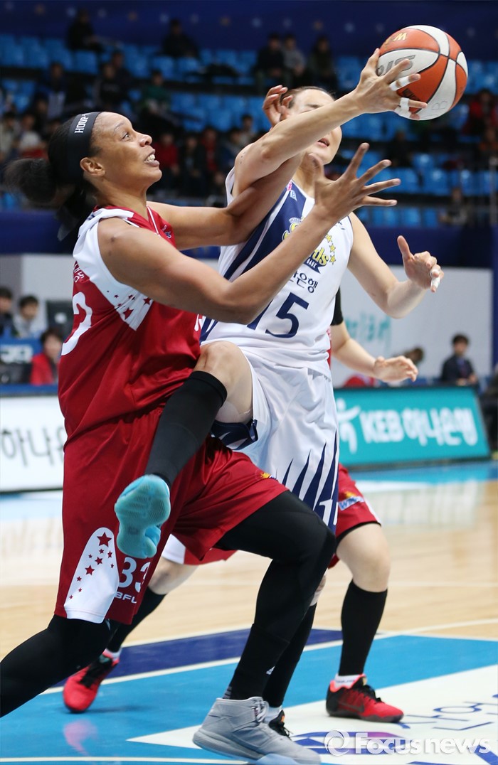 (인천=포커스뉴스) 14일 인천도원체육관에서 열린 2015~2016 여자프로농구 신한은행-KDB생명 경기에서 신한은행 신정자와 KDB생명 플레넷이 치열한 리바운드볼 다툼을 하고 있다.