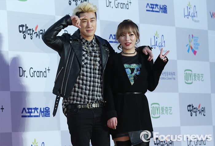(서울=포커스뉴스) 14일 오후 서울 송파구 올림픽 체조경기장에서 열린 '25회 하이원 서울가요대상' 시상식에 참석한 래퍼 산이(왼쪽)와 가수 강민희가 포토타임을 갖고 있다.