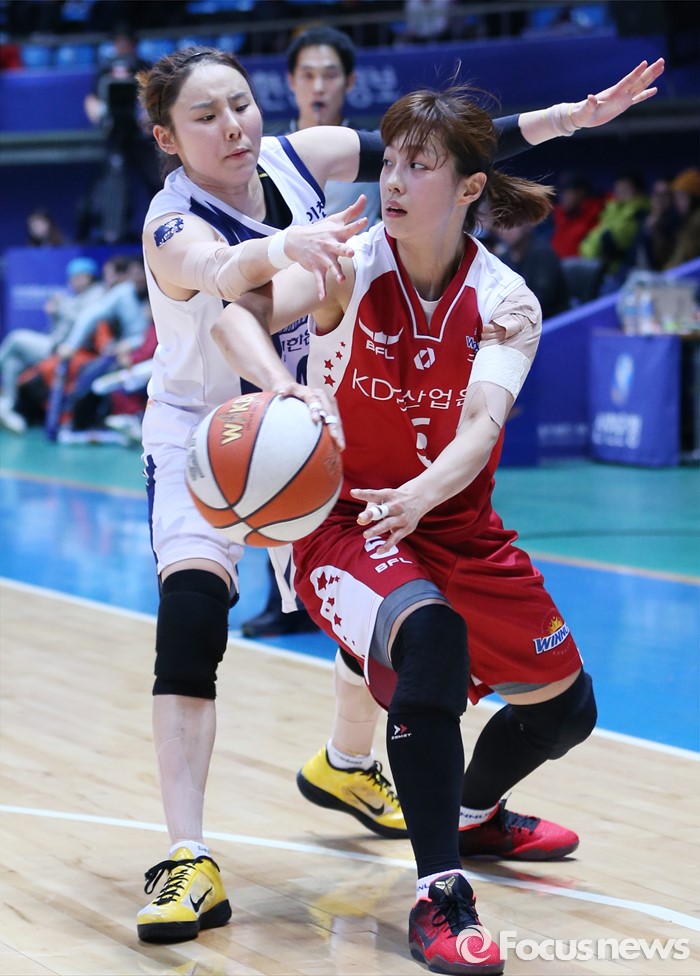 (인천=포커스뉴스) 14일 인천도원체육관에서 열린 2015~2016 여자프로농구 신한은행-KDB생명 경기에서 KDB생명 이경은이 신한은행 최윤아의 밀착수비를 피해 패스하고 있다.