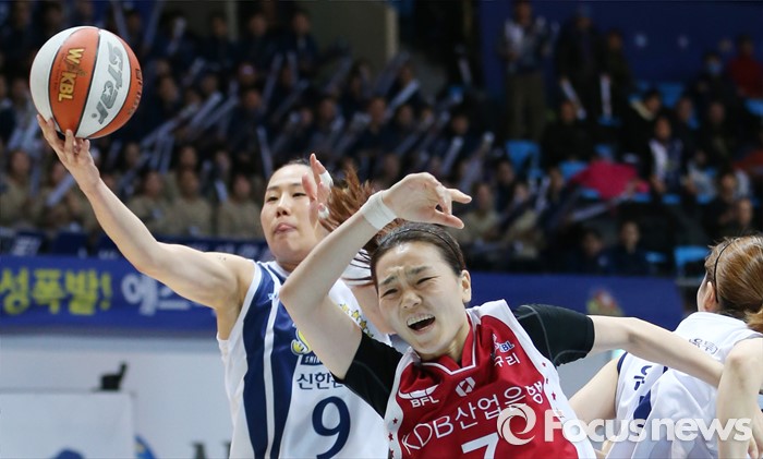 (인천=포커스뉴스) 14일 인천도원체육관에서 열린 2015~2016 여자프로농구 신한은행-KDB생명 경기에서 신한은행 곽주영(9)이 KDB생명 한채진을 제치고 리바운드볼을 잡고 있다.