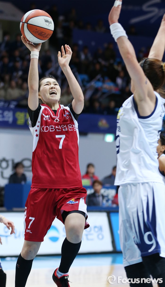 (인천=포커스뉴스) 14일 인천도원체육관에서 열린 2015~2016 여자프로농구 신한은행-KDB생명 경기에서 KDB생명 한채진이 신한은행 곽주영의 수비를 앞에 두고 레이업슛을 시도하고 있다.