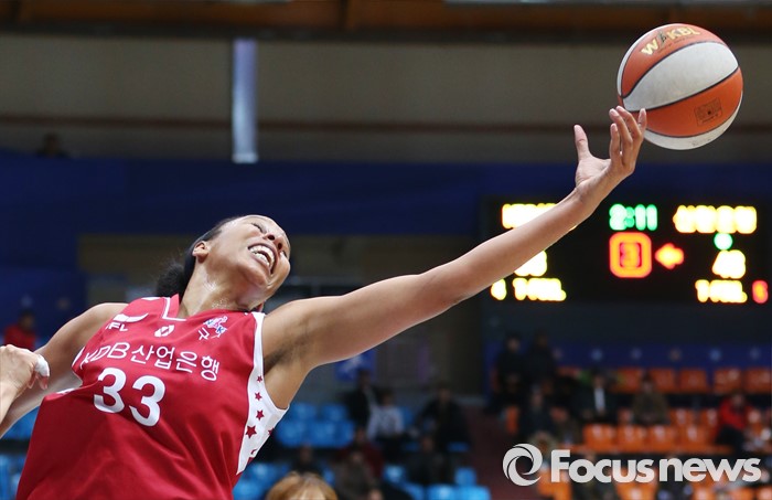 (인천=포커스뉴스) 14일 인천도원체육관에서 열린 2015~2016 여자프로농구 신한은행-KDB생명 경기에서 KDB생명 플레넷이 리바운드볼을 잡다 놓치고 있다.