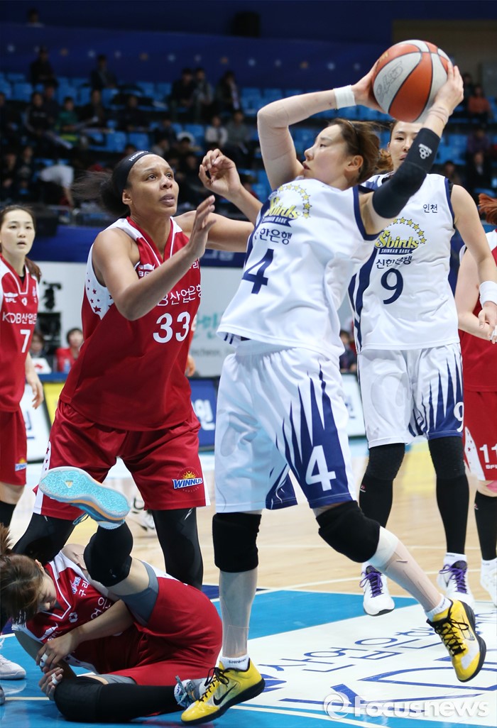 (인천=포커스뉴스) 14일 인천도원체육관에서 열린 2015~2016 여자프로농구 신한은행-KDB생명 경기에서 KDB생명 이경은이 신한은행 최윤아와 리바운드볼을 다투다 넘어지고 있다.