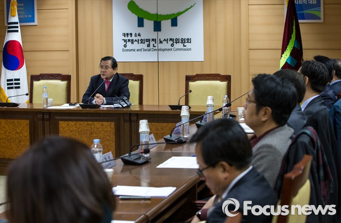 (서울=포커스뉴스) 15일 오전 서울 종로구 정부서울청사에서 노사정위원회 주최로 열린 '노동시장 구조개선 특별위원회 조찬간담회'에 참석한 김대환 경제사회발전노사정위원장이 모두발언을 하고 있다.