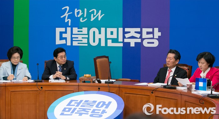 (서울=포커스뉴스) 15일 오전 서울 여의도 국회에서 열린 더불어민주당 최고위원회의에 참석한 문재인 대표가 잠시 자리를 비운 동안 회의가 진행되고 있다. 왼쪽부터 유승희, 전병헌, 정청래, 추미애 최고위원.