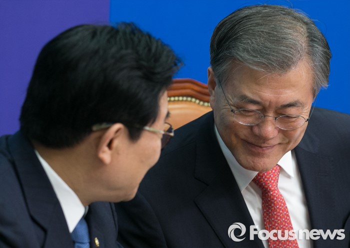 (서울=포커스뉴스) 문재인(오른쪽) 더불어민주당 대표가 15일 오전 서울 여의도 국회에서 열린 최고위원회의에 참석해 전병헌 최고위원과 대화하고 있다.