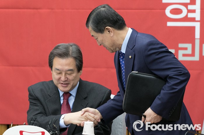 (서울=포커스뉴스) 김무성(왼쪽) 새누리당 대표와 황진하 사무총장이 15일 오전 서울 여의도 국회에서 열린 주요당직자회의에 참석해 악수하고 있다.