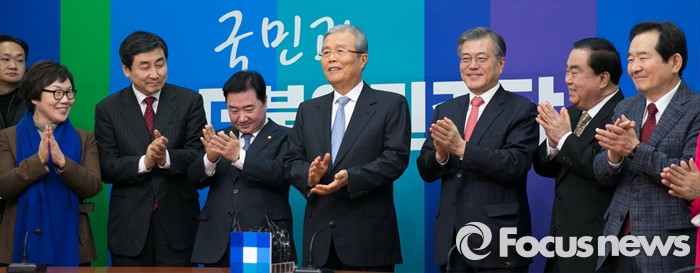 (서울=포커스뉴스) 더불어민주당 조기선대위원장으로 영입된 김종인 전 새누리당 국민행복추진위원장이 15일 오전 서울 여의도 국회에서 기자간담회에 앞서 의원들과 함께 포즈를 취한 뒤 박수치고 있다. 왼쪽부터 이미경 의원, 이종걸 원내대표, 이석현 국회 부의장, 김 위원장, 문재인 대표, 문희상, 정세균 의원.
