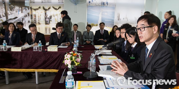 (세종=포커스뉴스) 이준식 사회부총리 겸 교육부장관이 15일 오전 세종시 조치원여자중학교에서 열린 자유학기제 현장간담회에 참석해 인사말을 하고 있다.