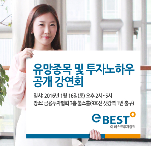 이번 강연회는 이베스트투자증권 마케팅팀의 김영석 과장이 강사로 나서 2016년 상반기 유망섹터와 종목군에 대해 설명할 예정이다.