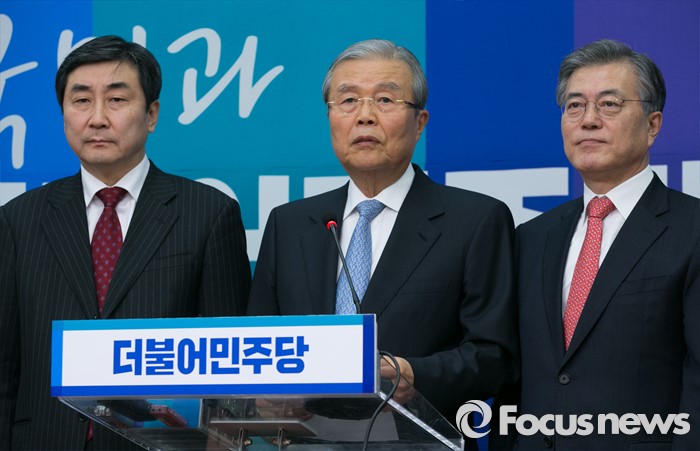 (서울=포커스뉴스) 더불어민주당 조기선대위원장으로 영입된 김종인 전 새누리당 국민행복추진위원장이 15일 오전 서울 여의도 국회에서 기자간담회를 하고 있다. 왼쪽부터 이종걸 원내대표, 김 위원장, 문재인 대표.
