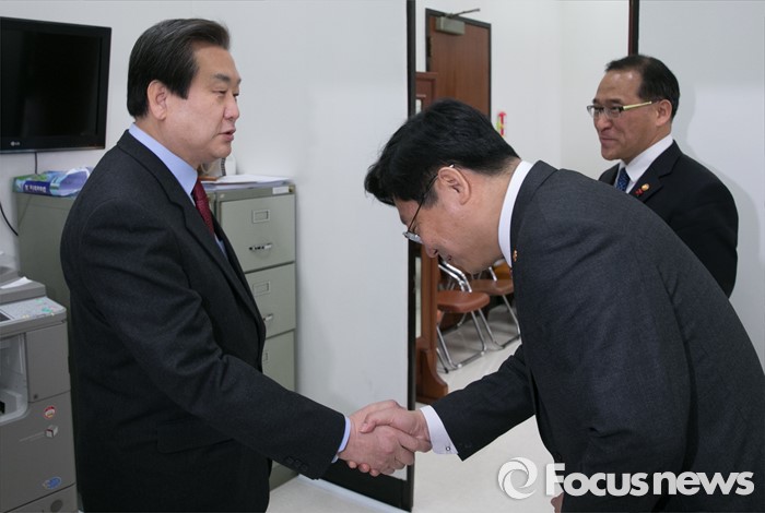 (서울=포커스뉴스) 주형환(오른쪽) 산업통상자원부 장관과 홍윤식(가운데) 행정자치부 장관이 15일 오전 서울 여의도 국회에서 새누리당 지도부를 취임 인사 차 예방, 김무성 대표와 인사하고 있다.