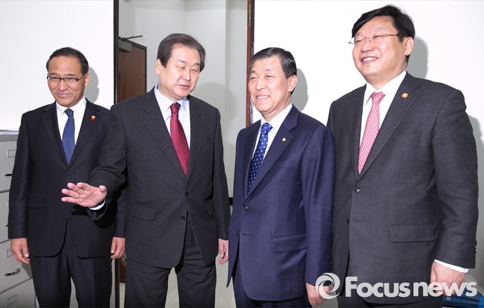 (서울=포커스뉴스) 김무성(왼쪽 두번째) 새누리당 대표가 15일 오전 서울 여의도 국회에서 취임 인사 차 방문한 주형환(오른쪽 첫번째) 산업통상자원부 장관, 홍윤식(왼쪽 첫번째) 행정자치부 장관과 기념촬영을 마친 뒤 취재진에게 양해를 구하고 있다. 오른쪽 두번째는 황진하 새누리당 사무총장.