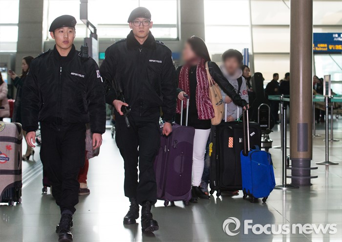 (인천공항=포커스뉴스) 한국공항공사 콜센터로 '전국공항'에 폭발물을 설치 했다는 협박 전화가 걸려온 15일 오후 인천국제공항 출국장에서 경찰특공대원들이 경계근무를 서고 있다.
