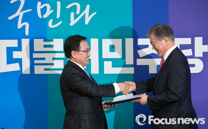 (서울=포커스뉴스) 문재인(오른쪽) 더불어민주당 대표가 15일 오후 서울 여의도 국회에서 열린 인재영입 기자회견에 참석해 유영민 전 포스코 경영연구소 사장으로부터 입당원서를 전달받고 있다.