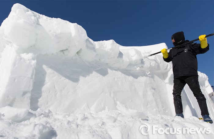 (평창=포커스뉴스) 15일 오후 강원도 평창군 횡계리 일대에서 열린 대관령 눈꽃축제에서 행사 관계자가 얼음작품을 조각하고 있다. 이번 행사는 오는 15일 시작해 내달 10일 강원 평창군 횡계리 일대에서 열린다.