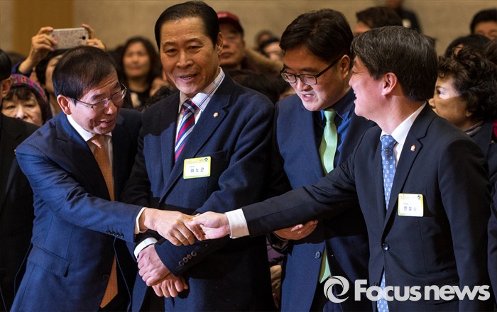 (서울=포커스뉴스) 15일 오후 서울 노원구청 대강당에서 열린 2016 노원구 신년인사회에 참석한 박원순(맨 왼쪽) 서울시장과 안철수(맨 오른쪽) 국민의당 인재영입위원장이 악수하고 있다.