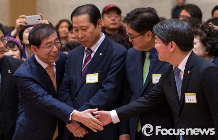 (서울=포커스뉴스) 15일 오후 서울 노원구청 대강당에서 열린 2016 노원구 신년인사회에 참석한 박원순(맨 왼쪽) 서울시장과 안철수(맨 오른쪽) 국민의당 인재영입위원장이 악수하고 있다.