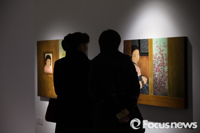 (서울=포커스뉴스) 15일 오후 서울 용산구 갤러리 조은에서 김덕용, 전병현 작가 초대전이 열리고 있는 가운데 관람객들이 김덕용 작가의 작품을 감상하고 있다.