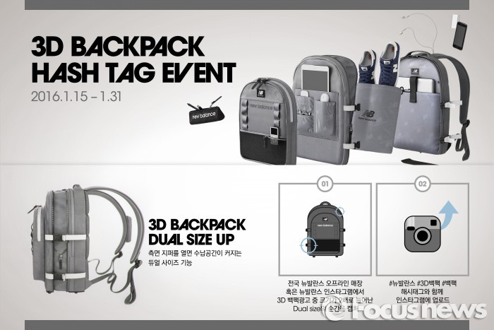 (서울=포커스뉴스) 뉴발란스는 신학기 가방 ‘3D 백팩’을 증정하는 해시태그 이벤트를 진행한다고 15일 밝혔다.