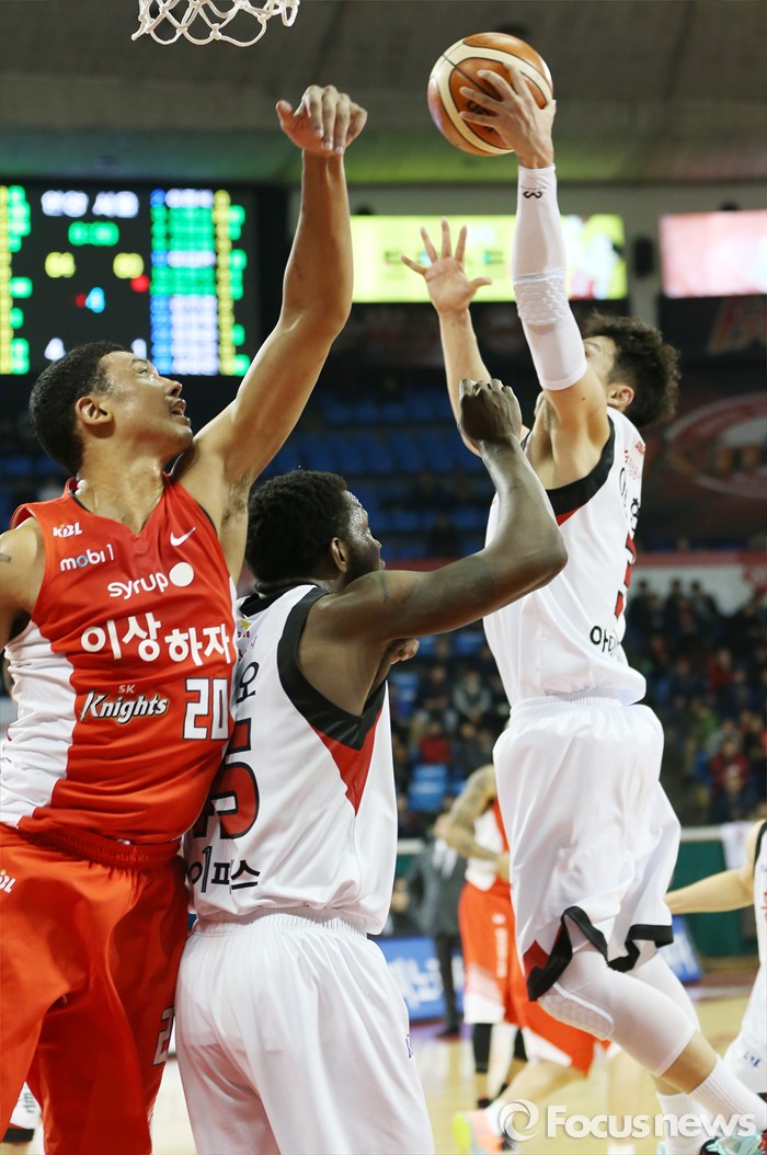 (서울=포커스뉴스) 15일 서울 잠실학생체육관에서 열린 2015-2016 프로농구 SK-KGC 경기에서 KGC 이정현이 SK 박승리에 앞서 리바운드볼을 잡고 있다.