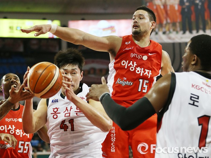 (서울=포커스뉴스) 15일 서울 잠실학생체육관에서 열린 2015-2016 프로농구 SK-KGC 경기에서 리바운드볼을 잡은 KGC 오세근이 SK 김민수와 사이먼의 집중 수비를 당하고 있다.