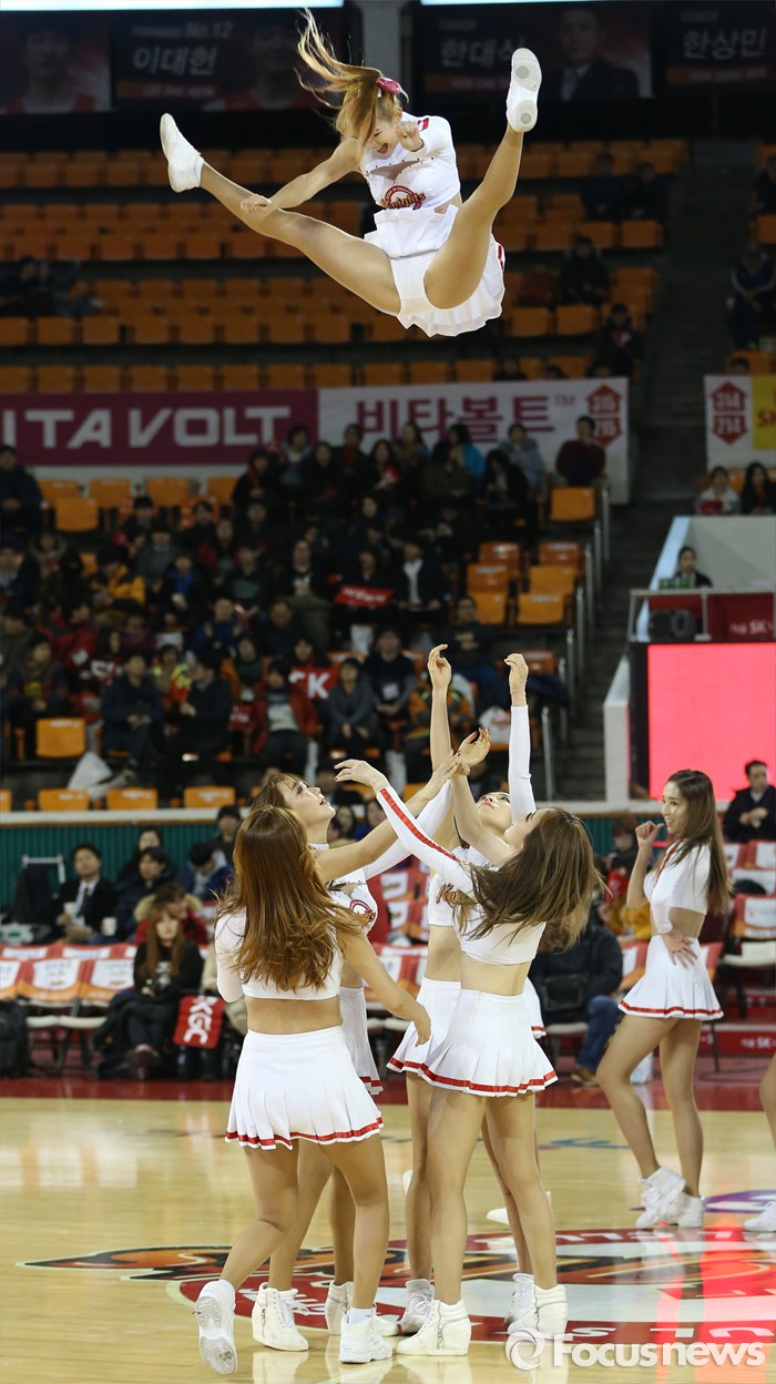 (서울=포커스뉴스) 15일 서울 잠실학생체육관에서 열린 2015-2016 프로농구 SK-KGC 경기에서 SK 치어리더가 경기 시작전 코트의 분위기를 끌어 올리는 스턴트 치어리딩을 공연하고 있다.