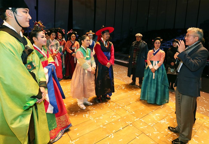 (서울=포커스뉴스) 김종덕 문화체육관광부 장관이 안호상 국립극장장 등 관계자들과16일 서울 국립극장에서 선보인 극장형 마당놀이 ‘춘향이 온다’를 관람하고 배우들을 격려하고 있다. <사진제공=문화체육관광부>