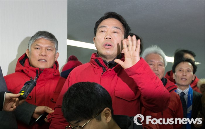 (서울=포커스뉴스) 안대희 전 대법관이 17일 서울 여의도 새누리당사에서 열린 기자회견에서 제 20대 총선 마포갑 출마를 공식 선언을 하자 강승규 마포갑 당협위원장이 항의하고 있다.