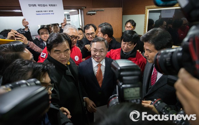 (서울=포커스뉴스) 안대희 전 대법관이 17일 서울 여의도 새누리당사에서 열린 기자회견에서 제 20대 총선 마포갑 출마를 공식 선언 했다. 안대희 전 대법관이 강승규 마포갑 당협위원장 지지자들의 항의 속에 자리를 빠져나오고 있다.