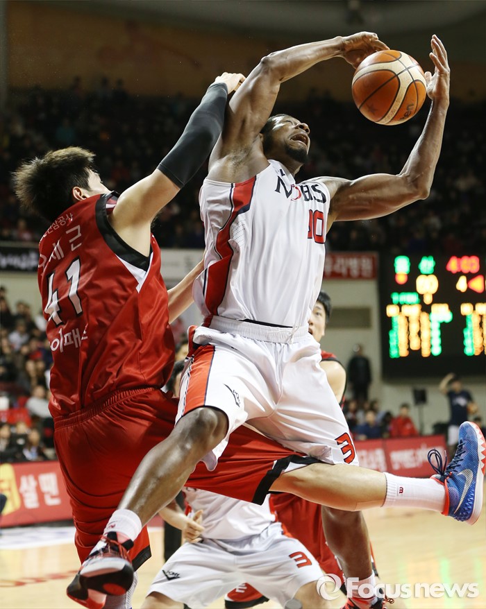 (안양=포커스뉴스) 17일 안양실내체육관에서 열린 2015-2016 프로농구 KGC-모비스 경기에서 모비스 빅터가 KGC 오세근에 앞서 리바운드볼을 잡아내고 있다.