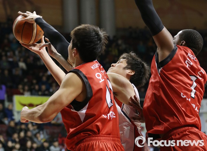 (안양=포커스뉴스) 17일 안양실내체육관에서 열린 2015-2016 프로농구 KGC-모비스 경기에서 모비스 함지훈의 골밑슛을 KGC 오세근이 쳐내고 있다.