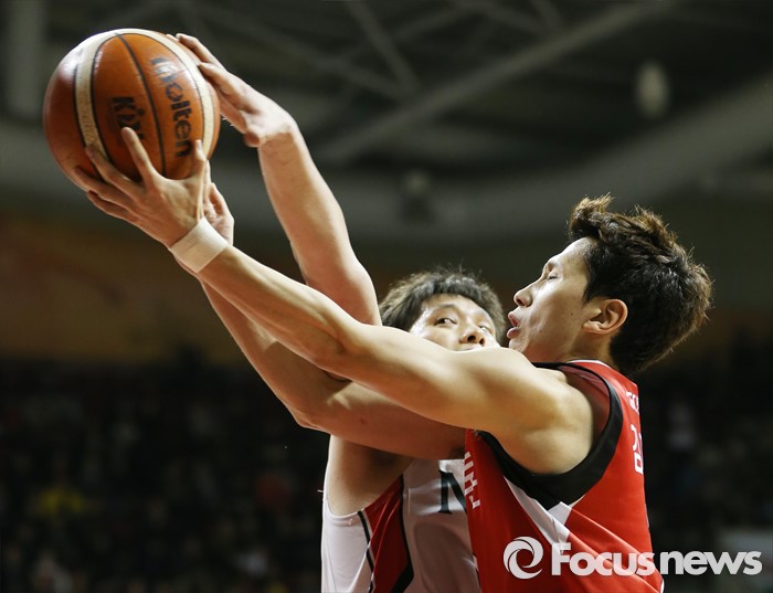 (안양=포커스뉴스) 17일 안양실내체육관에서 열린 2015-2016 프로농구 KGC-모비스 경기에서 KGC 김기윤의 레이업슛을 모비스 함지훈이 블로킹하고 있다.